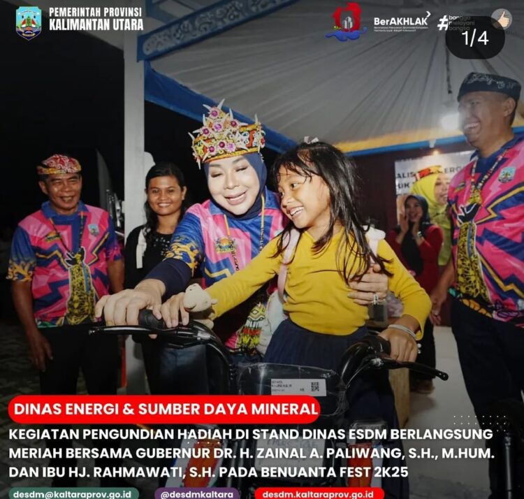KORANBORNEO,TANJUNG SELOR -Kemeriahan Stand Dinas ESDM pada hari terakhir Benuanta Fest 2025 memuncak saat Gubernur Kalimantan Utara, Dr. H. Zainal A. Paliwang, S.H., M.Hum. bersama Ibu Hj. Rahmawati, S.H. turun langsung mencabut undian dan menyerahkan hadiah sepeda listrik serta sepeda kepada para pemenang.